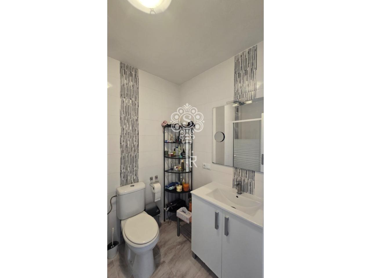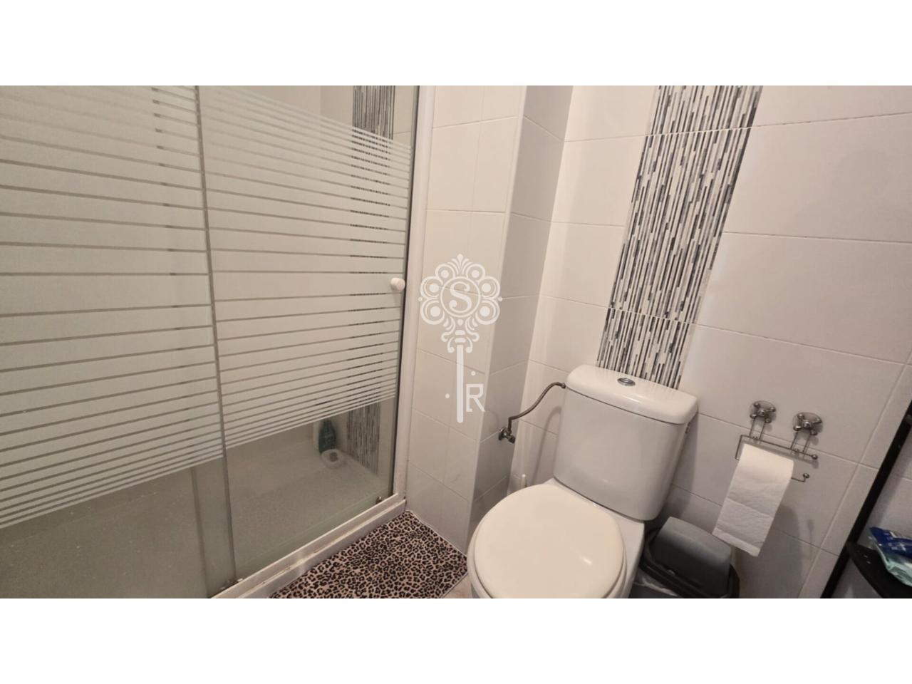 1 Baño completo: Reformado con estilo moderno, incluye plato de ducha con mampara de cristal, mueble de lavabo actual y revestimiento de azulejos con detalles en mosaico vertical.